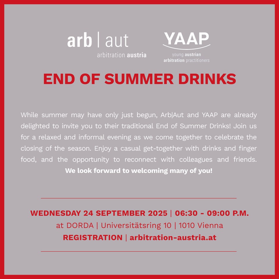 Unsubscribe: You received this email because you are a member of the Austrian Arbitration Association (ArbAut) or you provided your email address to us. If you wish to no longer receive regular updates from us, you may unsubscribe at any time by writing us at arbaut@arbitration-austria.at. For further information on the processing of your data and your data subject rights, please consult our Privacy Policy.