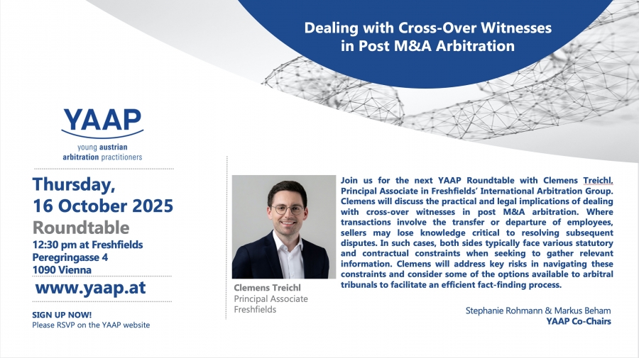 Join us for the next YAAP Roundtable with Clemens Treichl, Principal Associate in Freshfields’ International Arbitration Group. Clemens will discuss the practical and legal implications of dealing with cross-over witnesses in post M&A arbitration. Where transactions involve the transfer or departure of employees, sellers may lose knowledge critical to resolving subsequent disputes. In such cases, both sides typically face various statutory and contractual constraints when seeking to gather relevant information. Clemens will address key risks in navigating these constraints and consider some of the options available to arbitral tribunals to facilitate an efficient fact-finding process.
